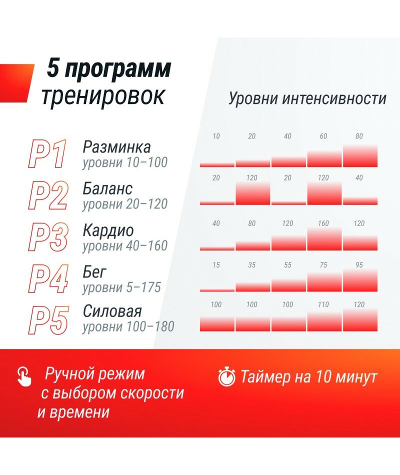 - Автоматический режим: Выберите одну из 5 встроенных программ тренировок.