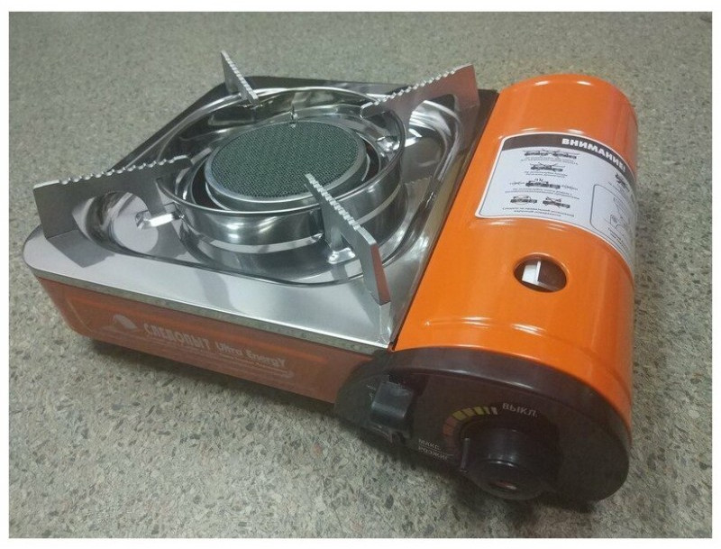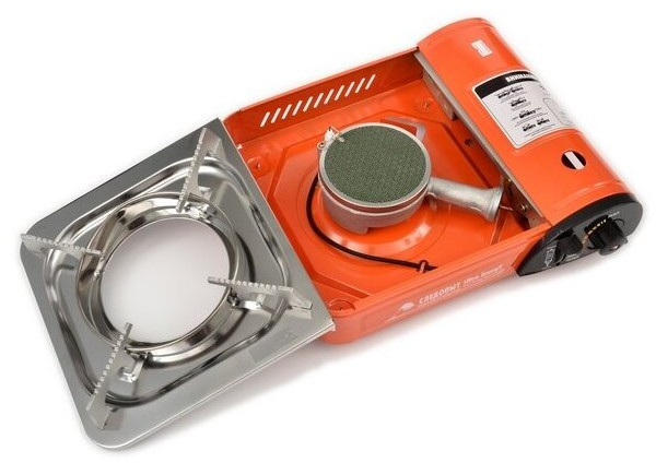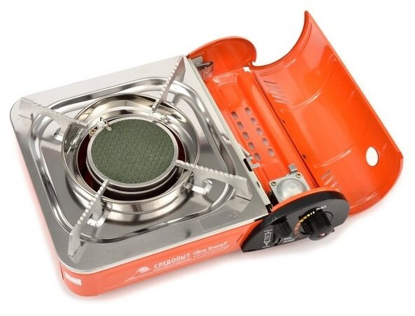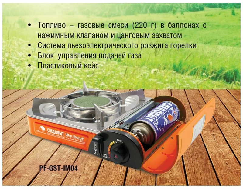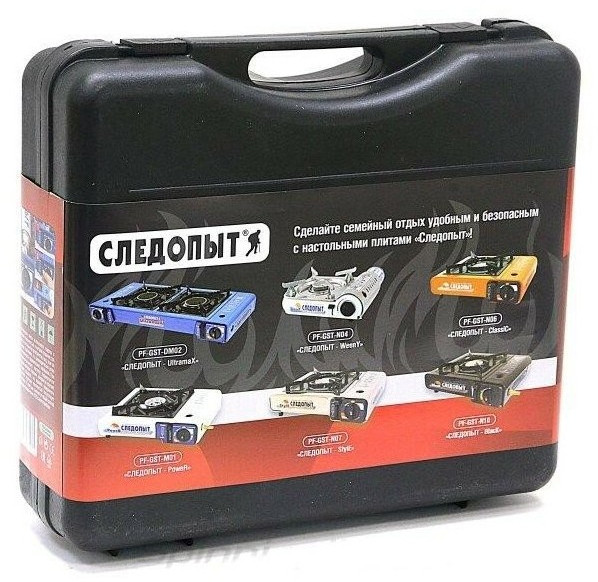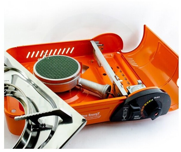 - Плита оборудована системой пьезоэлектрического розжига горелки и блоком управления подачей газа, а на время хранения и транспортировки размещается в пластиковом кейсе.