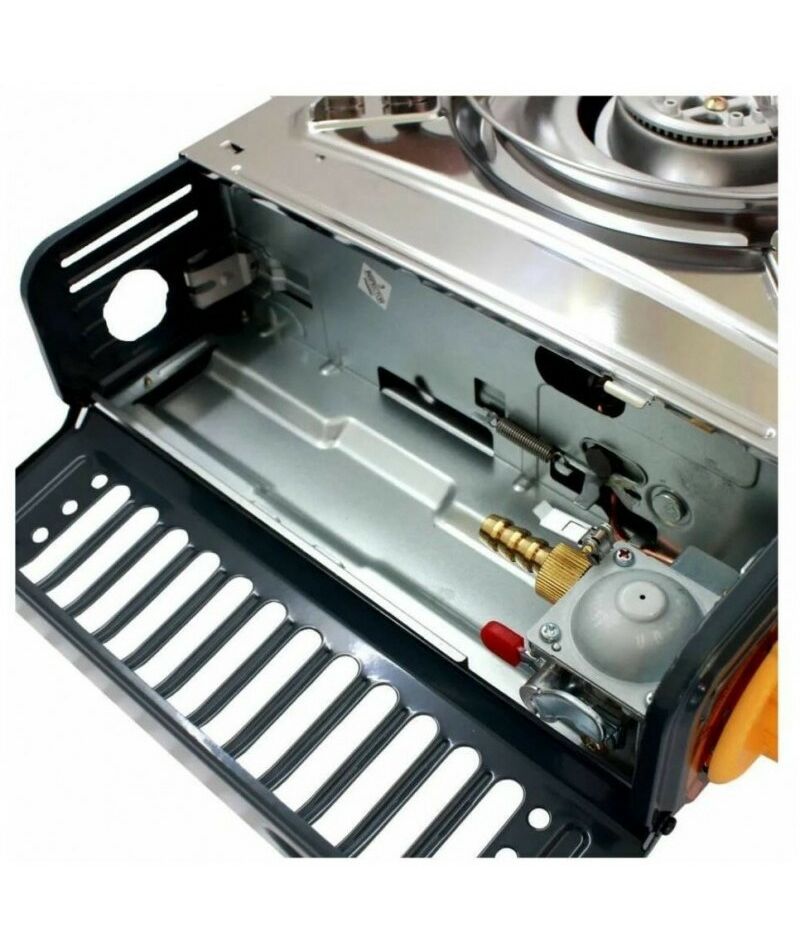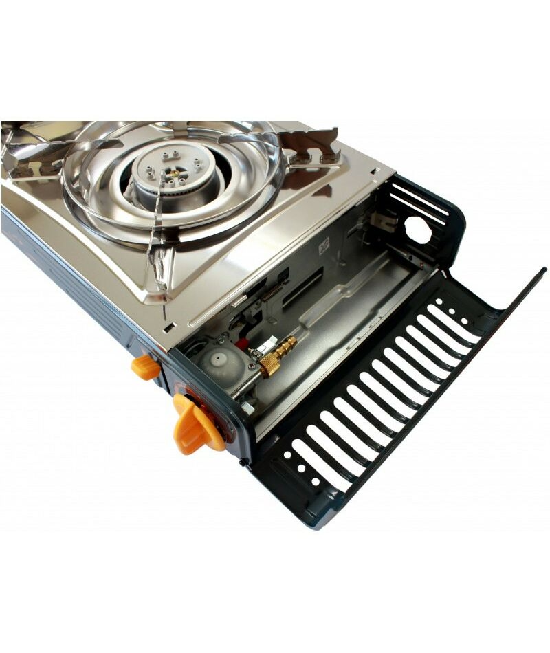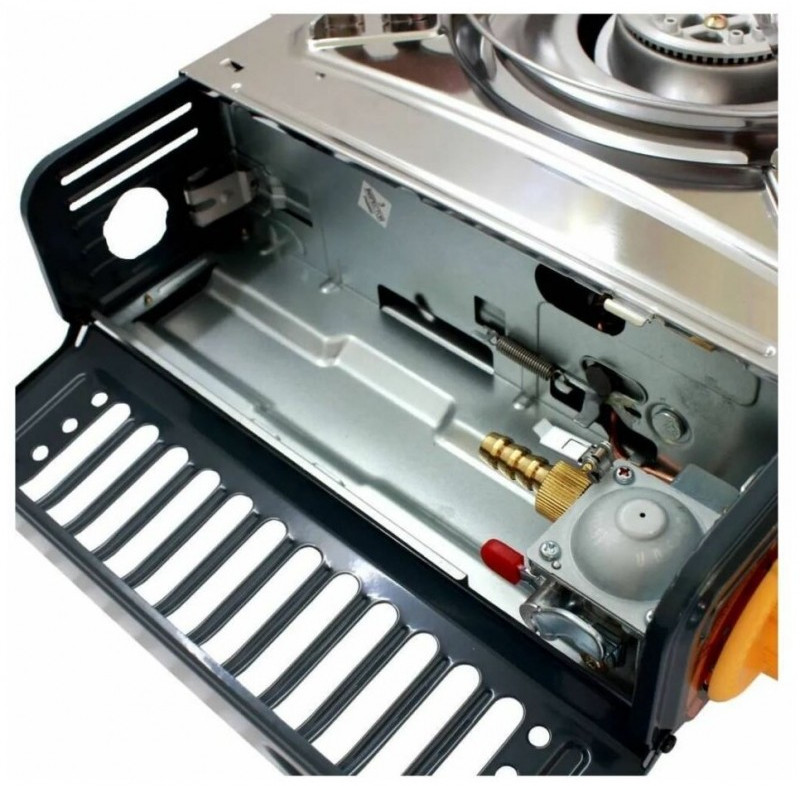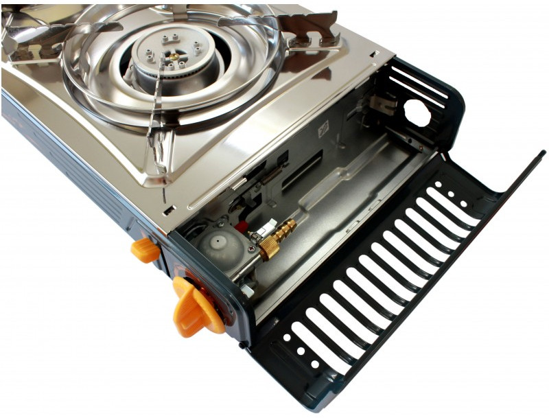 - Помимо всего прочего - сочетает в себе возможность работы как от одноразового (цангового) газового баллона, который размещается внутри плиты для каждой конфорки отдельно, так и от бытового баллона объёмом 5-50 литров, который подсоединяется к плите шлангом.