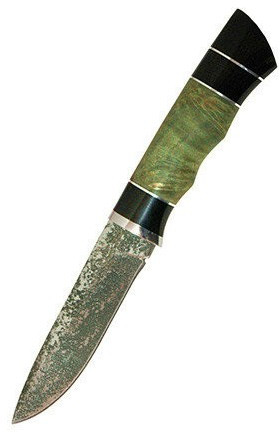 - Клинок имеет специальное травление под старину, рукоять наборная: стабилизированная карельская береза (этот материал обеспечивает особую прочность и плотность рукояти)