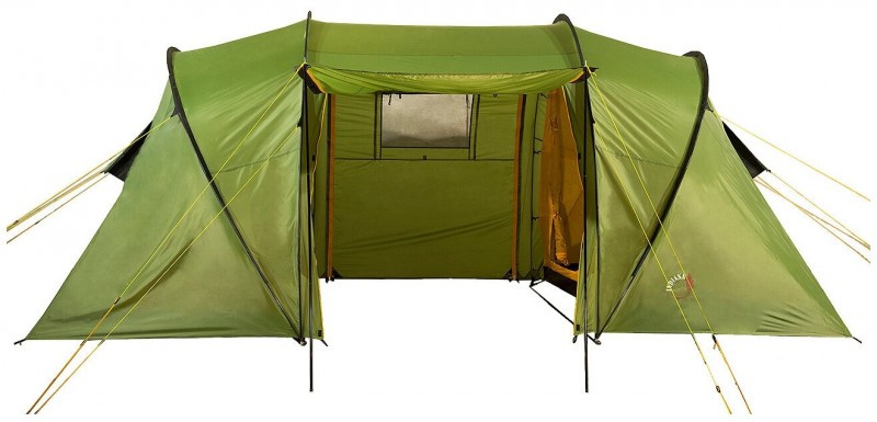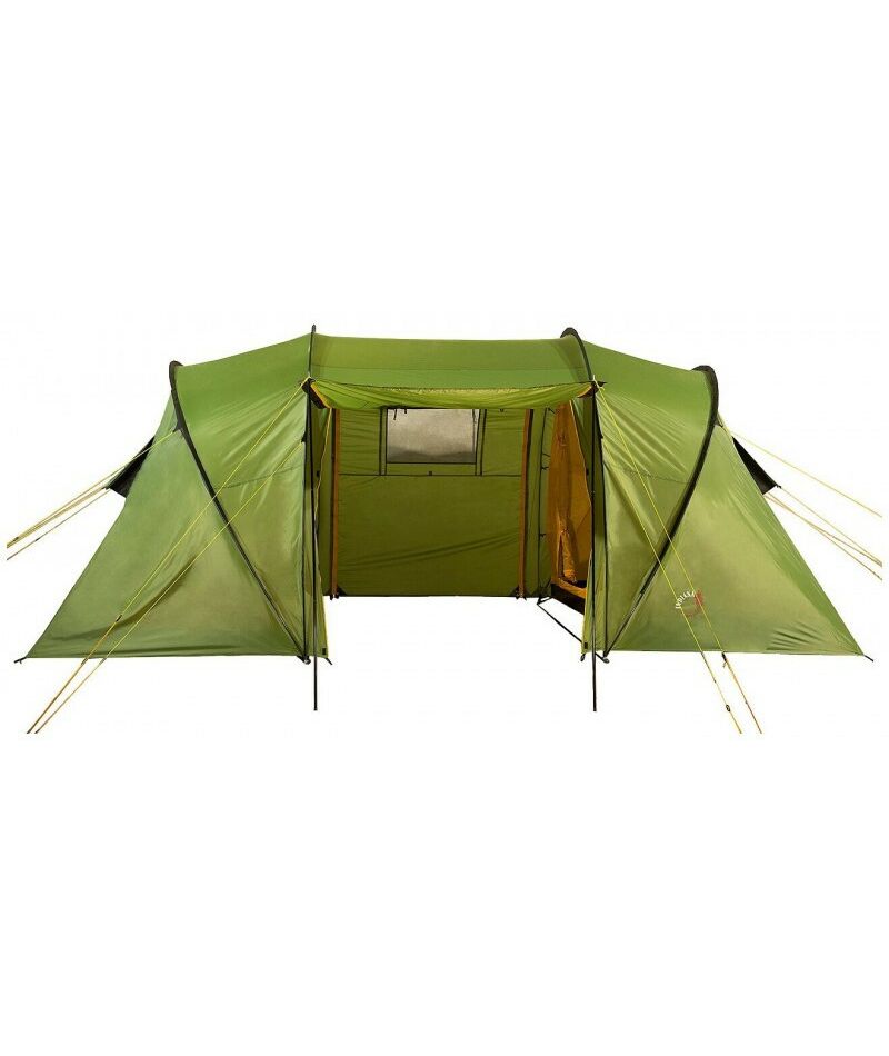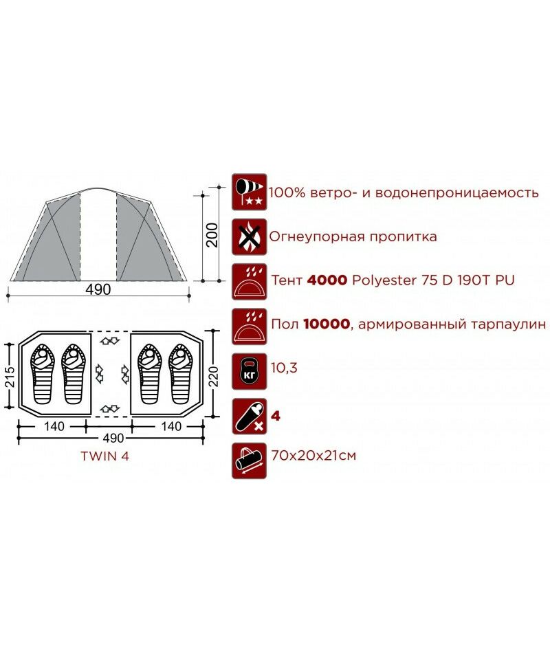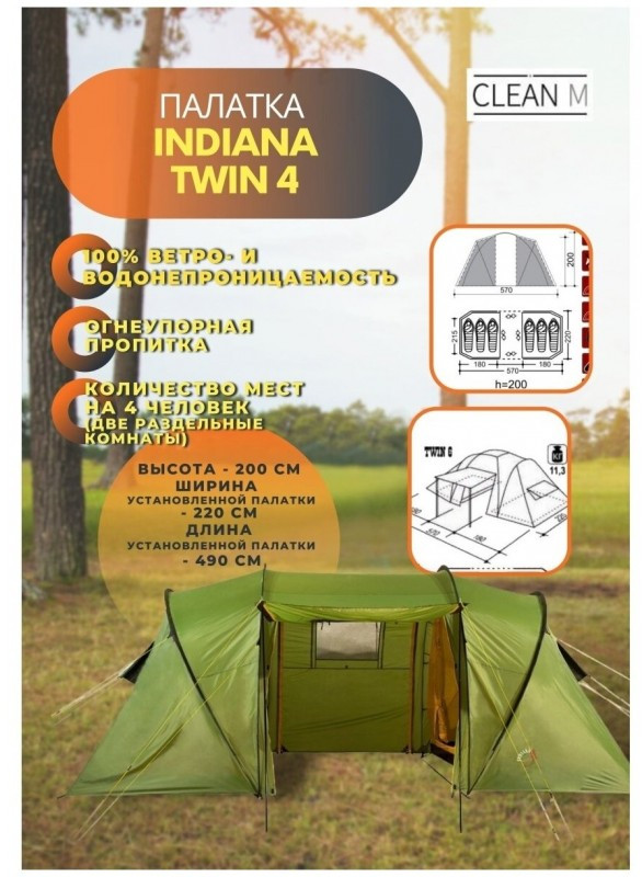Палатка Indiana Twin 4 рассчитана на удобное размещение 4 взрослых людей. Две раздельные комнаты, в каждой из которых может спать по 2 человека, отделены друг от друга большим тамбуром. Его можно сделать ещё просторнее за счёт открывающихся стенок, из которых собирается навес. У вас будет достаточно места, где можно установить кемпинговую мебель, оборудовать кухню и организовать хранение вещей. Палатка отлично проветривается, все помещения оснащены вентиляционными окнами с защитными козырьками и москитными сетками. Ставится и собирается эта модель буквально за несколько минут.