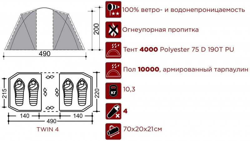 - Особенности: вентиляционные отверстия, внутренняя палатка, навес, огнеупорная пропитка, окна, проклеенные швы