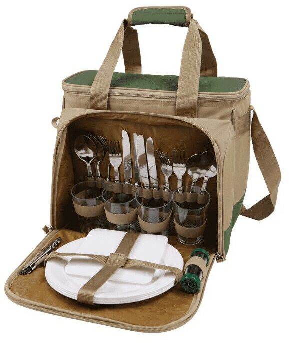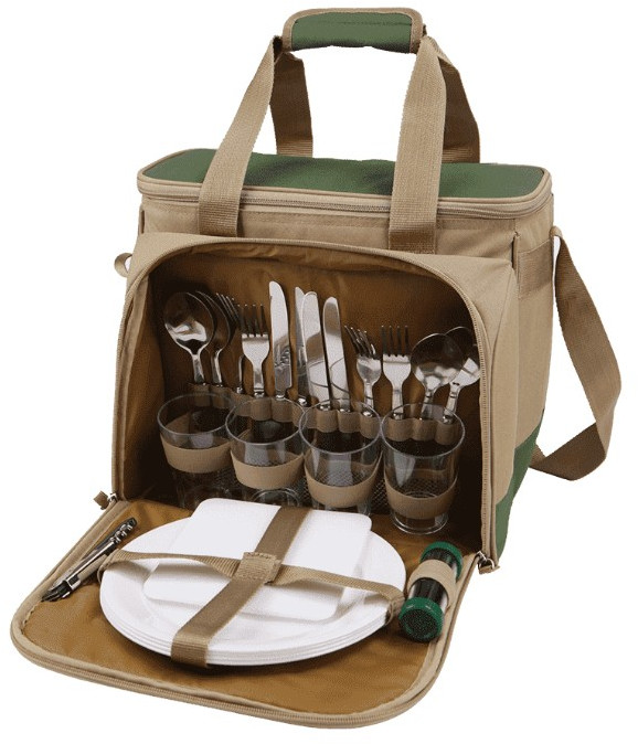 Сумка-холодильник с набором посуды (4 чел). Сумка-холодильник (13,5 л) 1 шт, стакан 4 шт, вилка 4 шт, ложка 4 шт, нож 4 шт, тарелка 4 шт, солонка-перечница 1 шт, штопор 1 шт, разделочная доска 1 шт. Внешний материал: оксфорд. Внутренний материал: экологичный водонепроницаемый материал PEVA