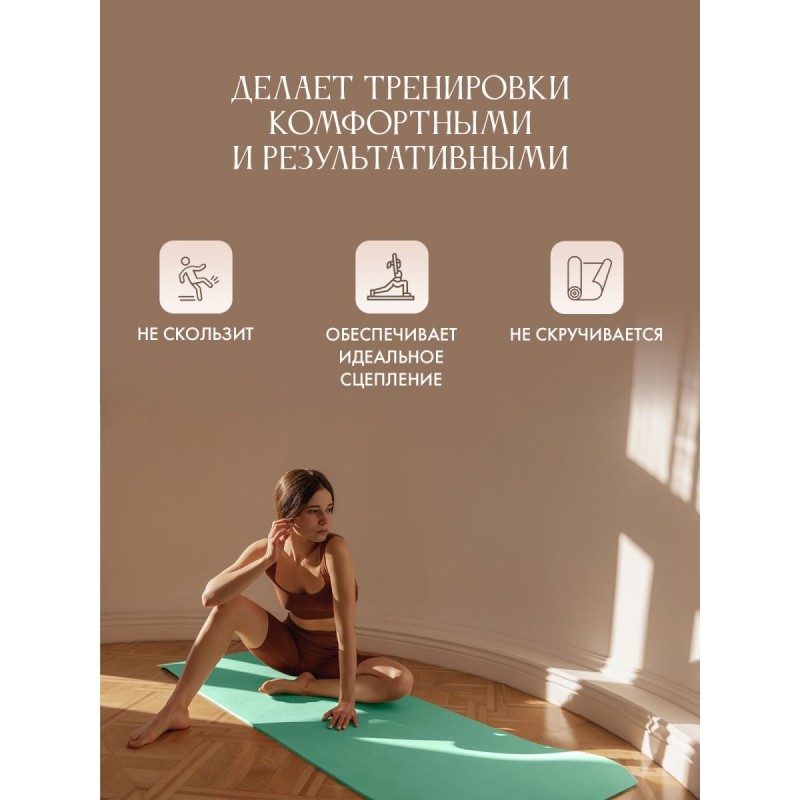 Мягкий и удобный коврик изготовлен из нетоксичных материалов, поэтому абсолютно безвреден для вашей кожи. Не скользит и имеет довольно большой размер (185 см), что поможет расслабиться и сосредоточиться на выполнении асан.
