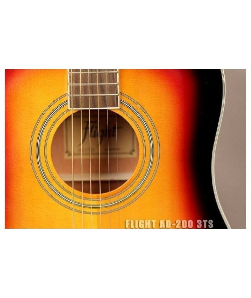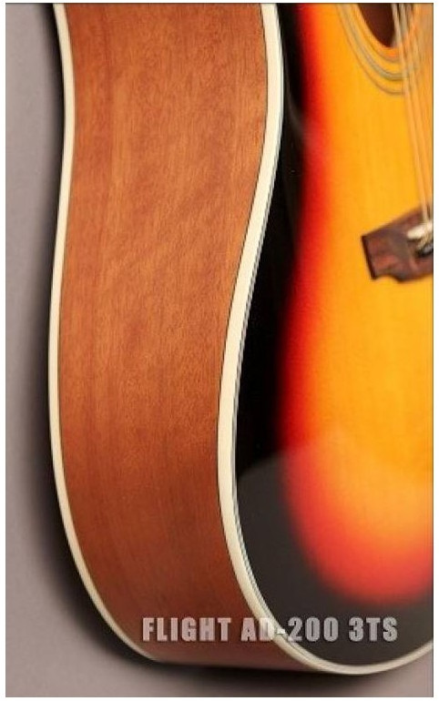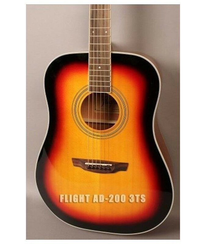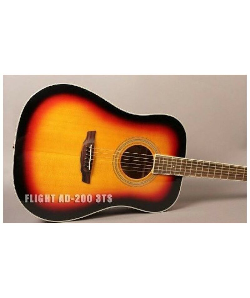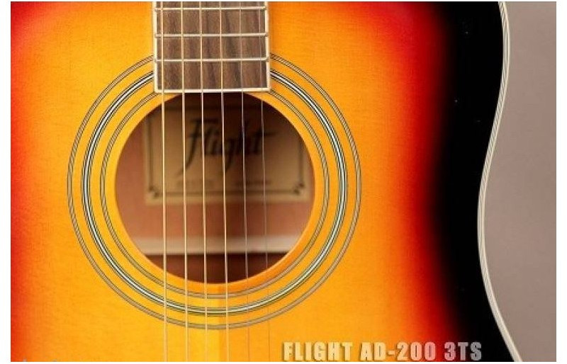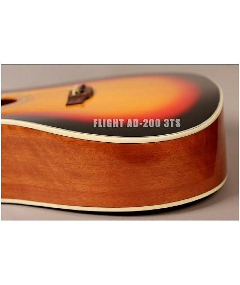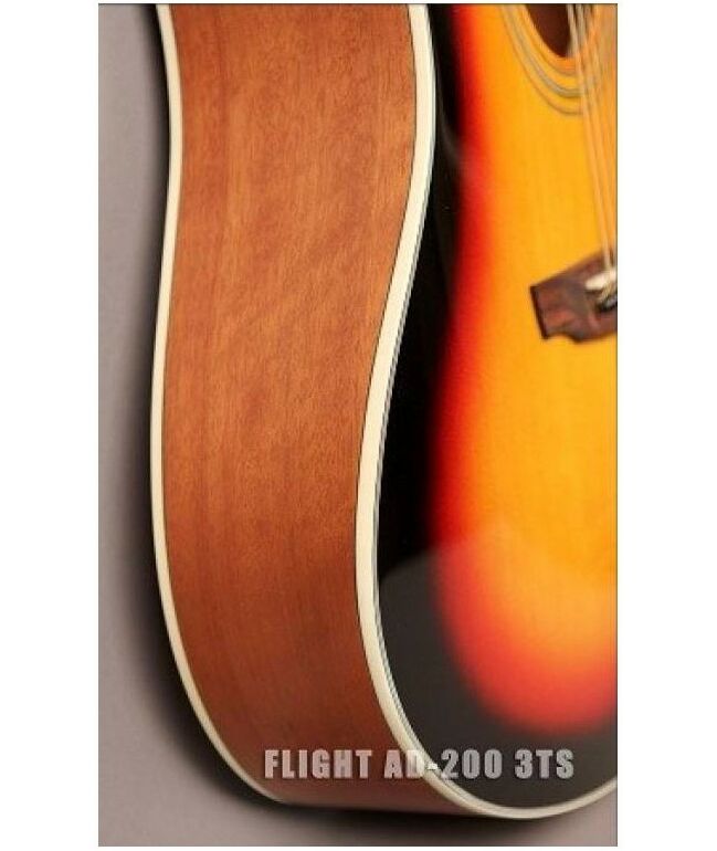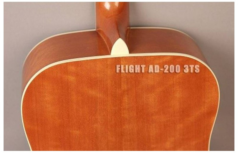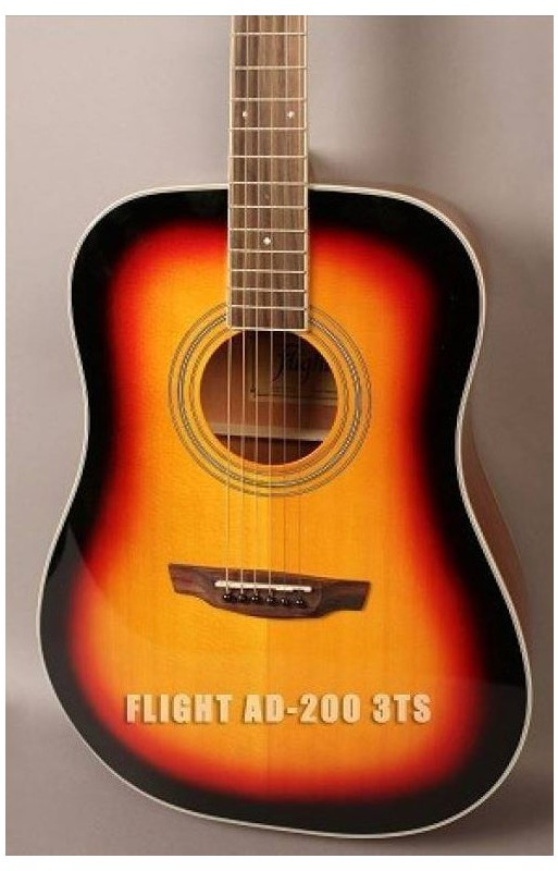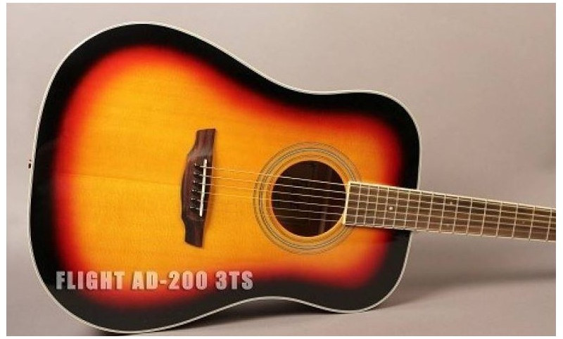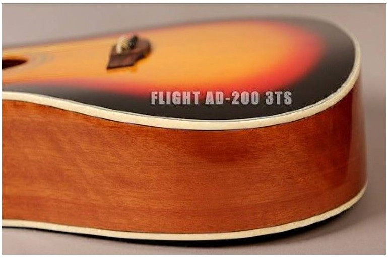 - Гитара Flight AD 200-3TS - прекрасный инструмент, который станет вашим верным спутником в любой ситуации. Этот инструмент обладает тремя неоспоримыми преимуществами, которые делают его хитом продаж: хороший звук, невысокая цена и неприхотливость в эксплуатации. Эту гитару вы всегда сможете взять с собой на природу, корпус гитары не требует постоянного ухода, увлажнения и поддержания нужной температуры в помещении. Обратите внимание на скос на корпусе под правую руку! Раньше таким скосом обладали только электрогитары, теперь Flight AD 200-3TS воплощает это удачное решение для акустического инструмента. Просто сравните ощущения от игры на гитаре со скосом с ощущениями от обычной гитары и почувствуйте насколько это удобно