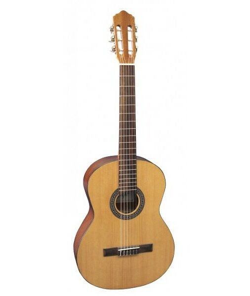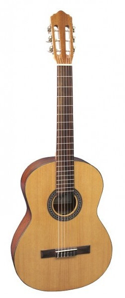 Верхняя дека изготовлена из ели, что обеспечивает чистое звучание, так необходимое для грамотного развития слуха. Нижняя дека и обечайки из сапеле, породы дерева по свойствам очень схожим с красным деревом, благодаря чему звук приобретает мягкость и глубину. Достаточно толстая, порядка 6 мм, палисандровая накладка на грифе создает в руке ощущение приятной весомости и надежности.