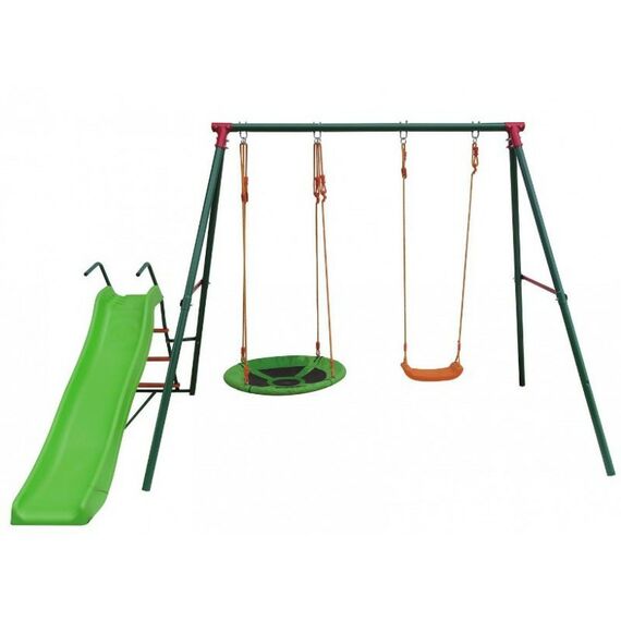 - Комплекс включает в себя веревочные качели (без спинки), качели - гнездо, а так же горка