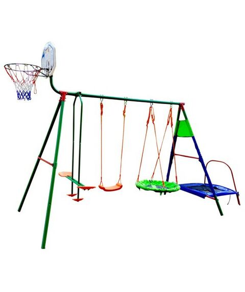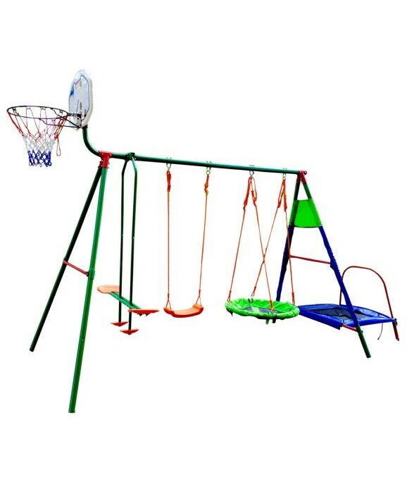 В комплекте: верёвочные качели, качели-качалки для двоих, качели-гнездо, мини-батут и кольцо для баскетбола (R18").