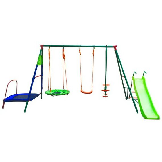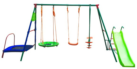 В комплекте: верёвочные качели, качели-качалки для двоих, качели-гнездо, горка и мини-батут.