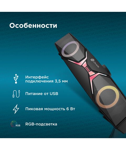 | Особенности | Регулировка громкости и RGB-подстветки. Подключение 3,5 мм. Питание от порта USB типа A |