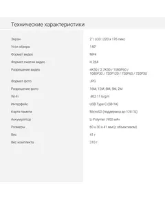 Основные характеристики Оптика Sony IMX179 Количество объективов 1 Угол обзора объектива 170 ° Максимальное разрешение видеозаписи 3840 х 2160 30 кадров/сек Режим видеозаписи 1 - 4K (3840х2160; 30к/с) Режим видеозаписи 2 - 2.7K (2688х1520; 30к/с) Режим видеозаписи 3 - 1080P...