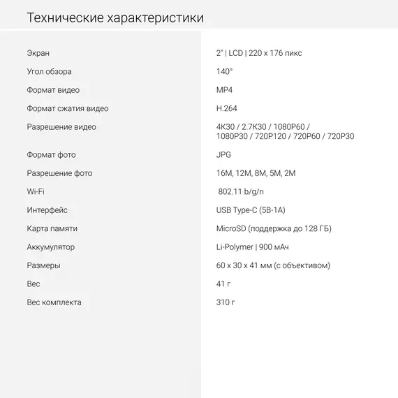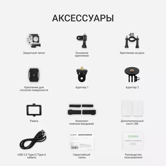 | Другие аксессуары в комплекте | Основное крепление; Крепление на руль велосипеда; Крепление на шлем; Адаптер-переходник; Адаптер на резьбу; Рамка; Повязка-бандаж |