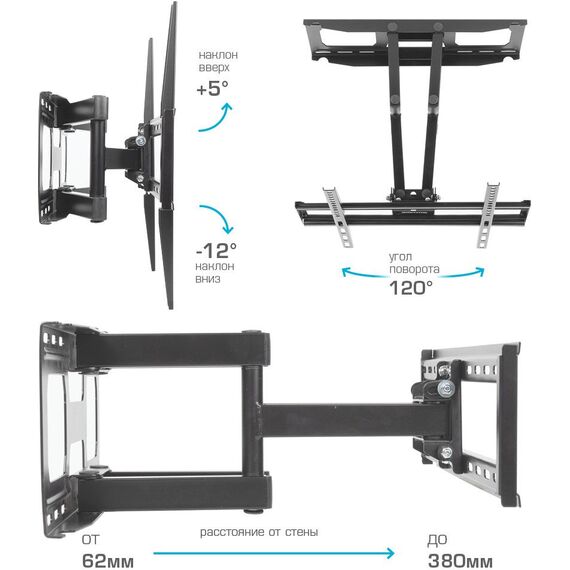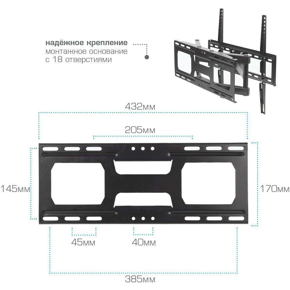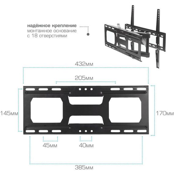 | Особенности | Усиленная стальная конструкция, Универсальный-телевизор на кронштейне можно наклонить, повернуть и сдвинуть к стене, Широкая монтажная пластина обеспечивает надежное крепление ТВ на стену, Легкий монтаж телевизора, Корректировка экрана ±5° |