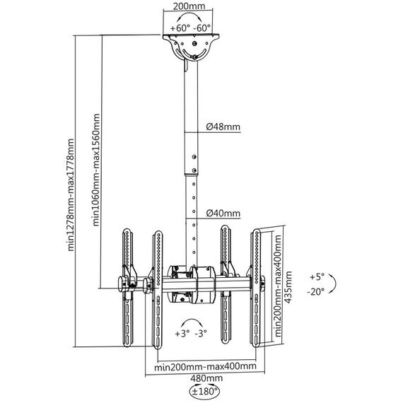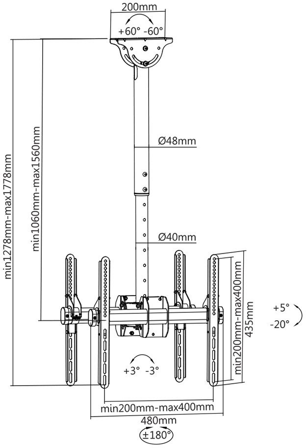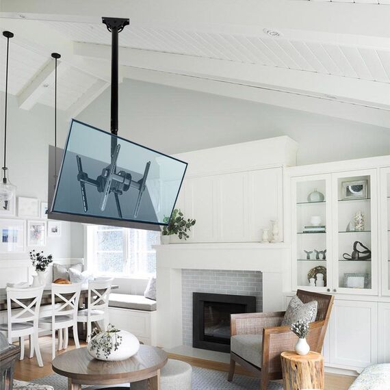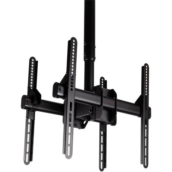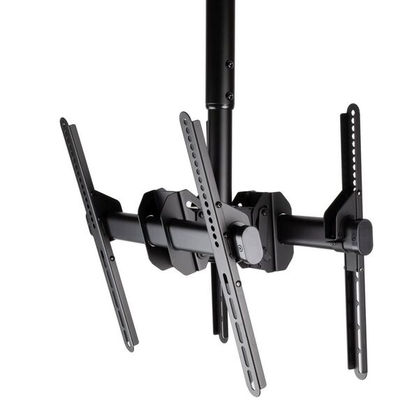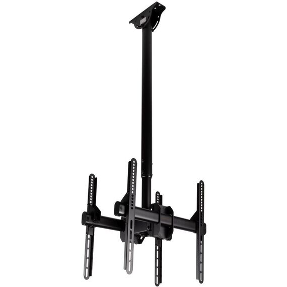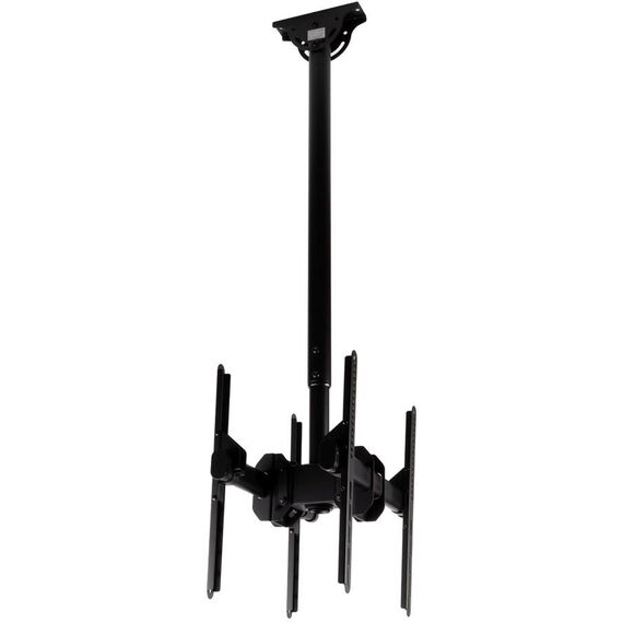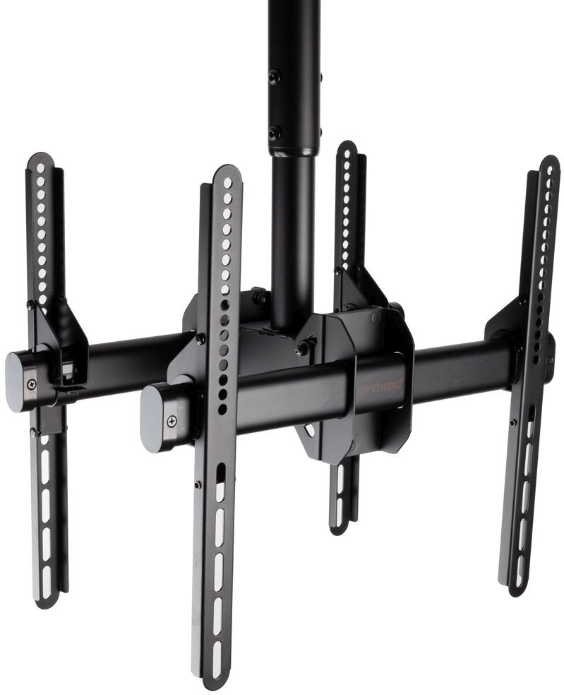 Потолочный кронштейн для LCD/LED телевизоров размером от 26 до 65 дюймов с максимальным весом до 2 x 45 кг с возможностью крепления на наклонный потолок. Надежная стальная конструкция. Регулировка наклона +5 -20 и углом поворота ±180 градусов. Максимальные крепежные размеры 400х400 мм.