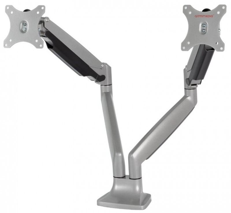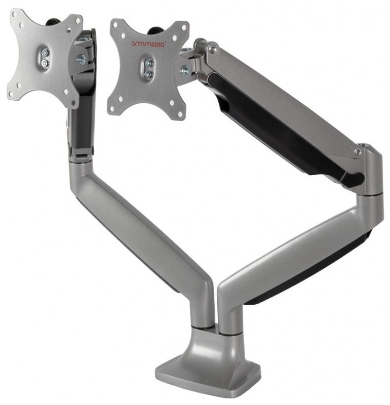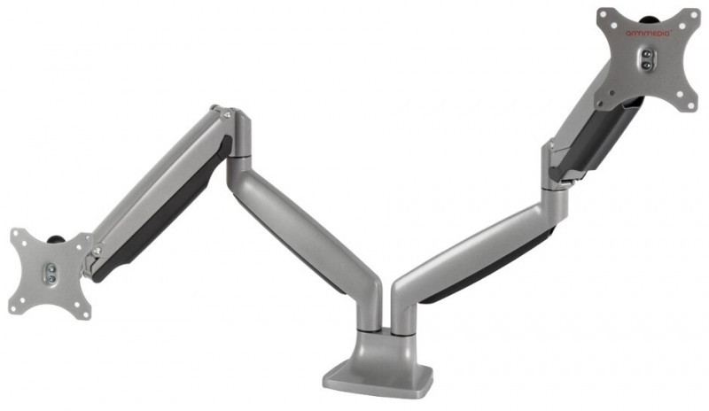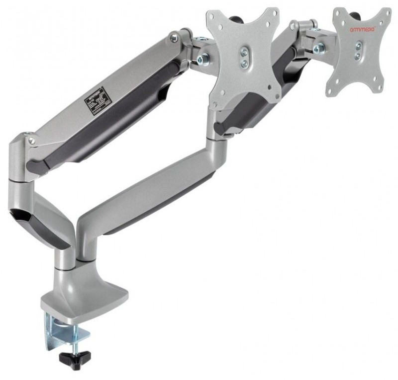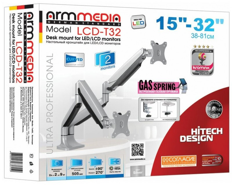 - Настольный кронштейн Arm-Media LCD-T32 предназначен для установки двух мониторов с диагональю от 15 до 32 дюймов (38-81 см) и весом от 2 до 9 кг каждый. При этом мы предусмотрели независимую регулировку каждого экрана: мониторы на кронштейнах можно поворачивать в портретно/альбомную ориентацию на 360°, наклонять вверх и вниз в диапазоне от 90° до -90°, приближать к себе или удалять от себя, поворачивать крепление влево или вправо на 270°. За счет встроенной двухколенной газовой пружины, Вы можете зафиксировать экран в любом удобном промежуточном положении, плавно перемещая экраны вверх и вниз в пределах 325 мм.