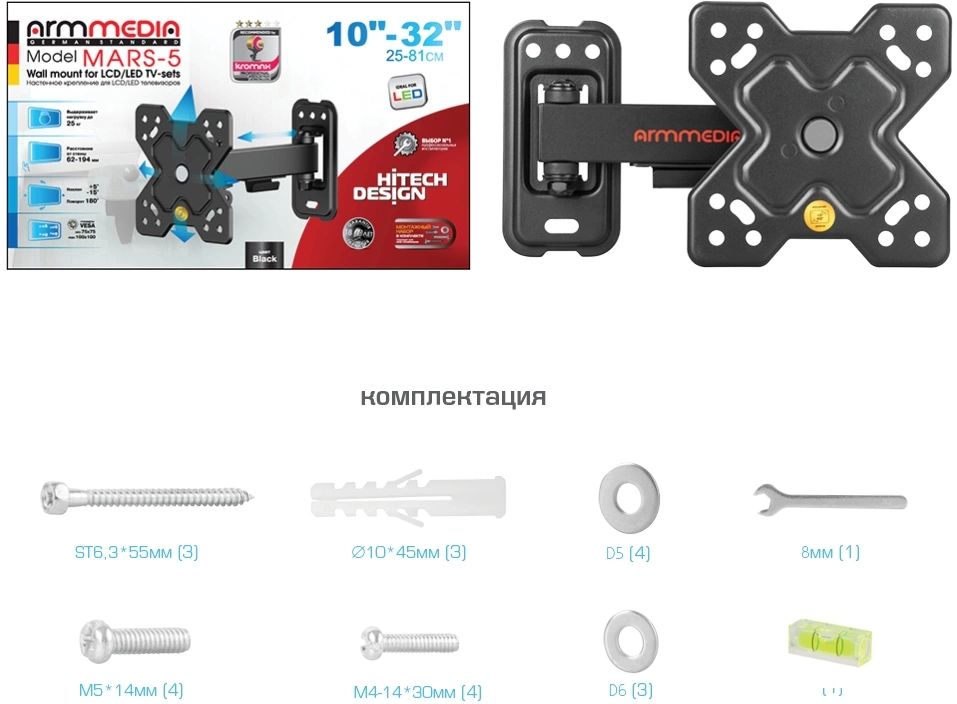 Кронштейн для телевизора ARM Media MARS-5 черный 10"-32" макс.25кг настенный поворот и наклон [90715]