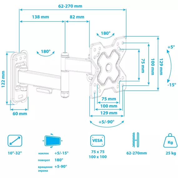 | Подходит для телевизоров c диагональю | 15", 19", 22", 24", 26", 28", 32" |