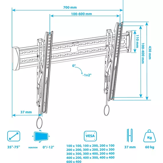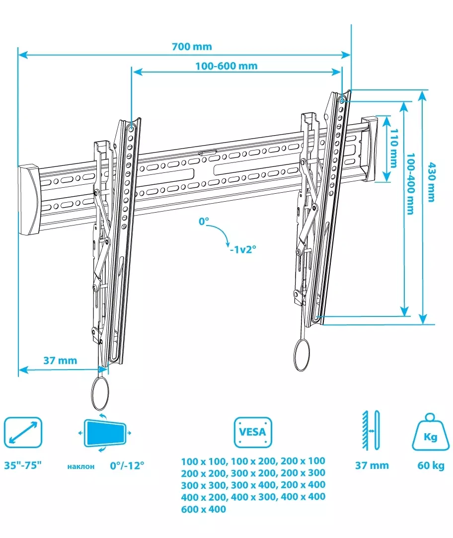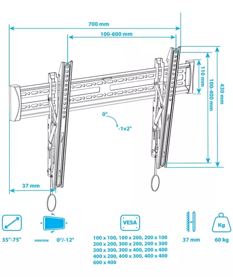 | Подходит для телевизоров c диагональю | 35", 37", 39", 40", 42", 43", 45", 46", 48", 49", 50", 52", 55", 60", 65", 70", 75" |