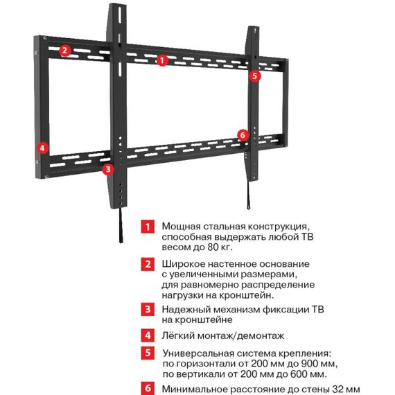 | Особенности | Универсальная система крепления: по горизонтали от 200 мм до 900 мм, по вертикали от 200 мм до 600 мм. |