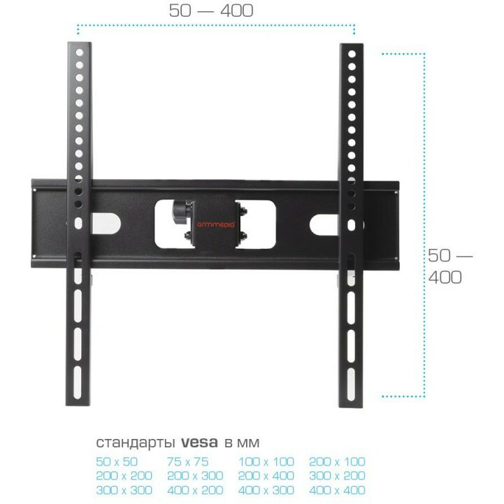 - Крепежные отверстия (VESA) 50 x 50, 75 x 75, 100 x 100, 200 x 100, 200 x 200, 300 x 200, 200 x 300, 300 x 300, 200 x 400, 400 x 200, 400 x 300, 400 x 400