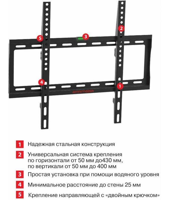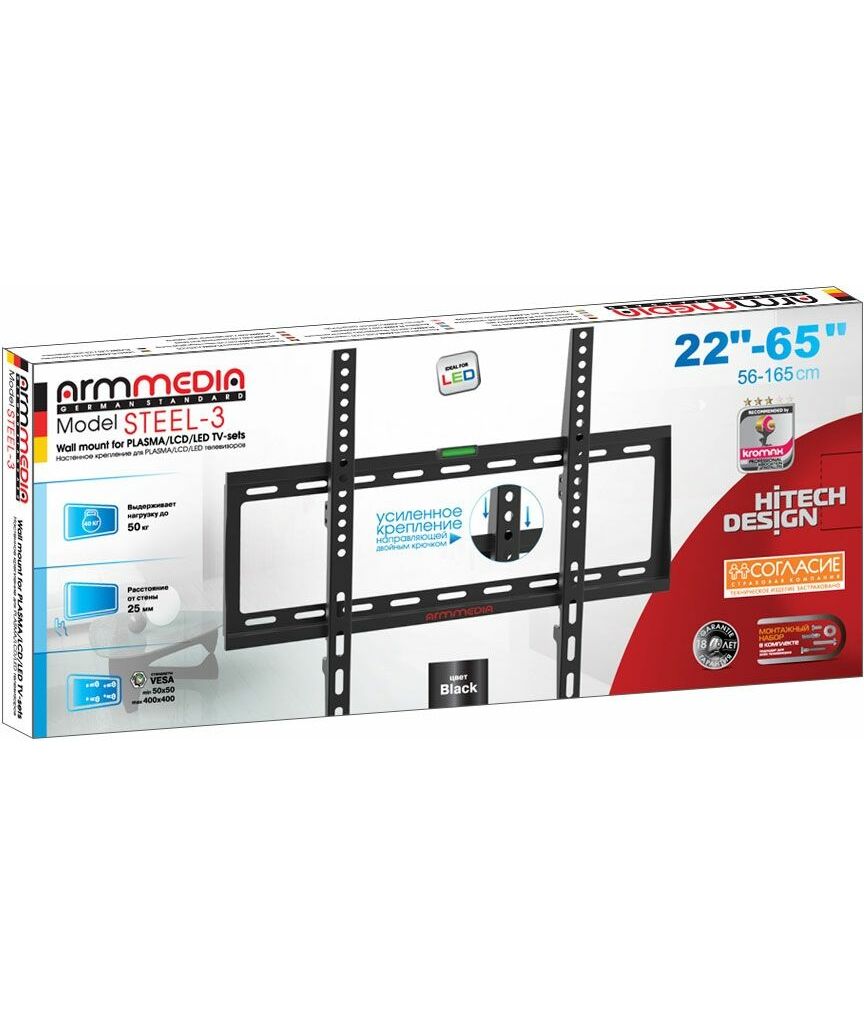 Кронштейн arm media STEEL-3, для LED/LCD/PLASMA телевизоров 22" - 65", max 50 кг, настенный, 0 степеней свободы, от стены 25 мм, max VESA 400x400 мм, крепление направляющей с "двойным крючком"