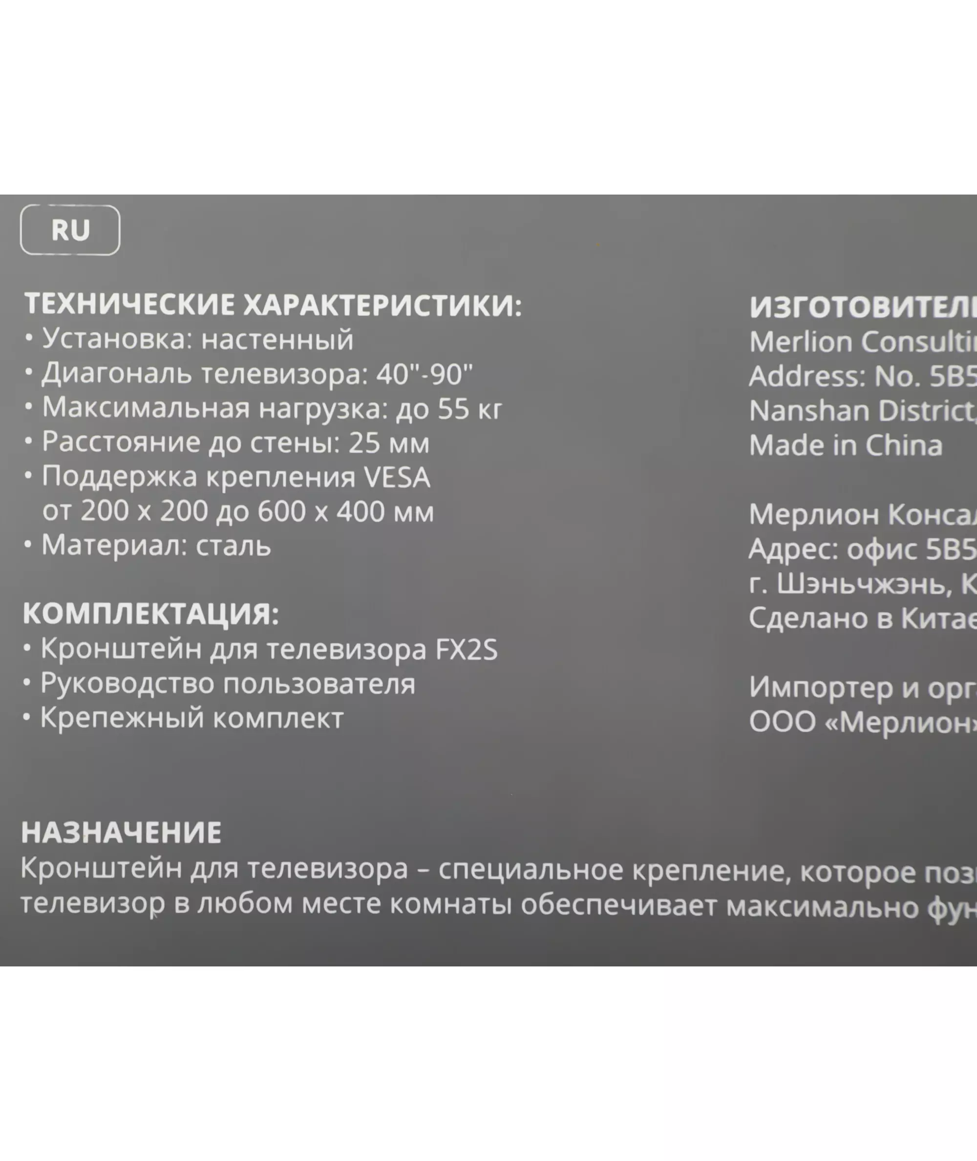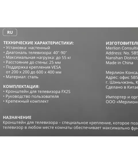 | Подходит для телевизоров c диагональю | 40", 42", 46", 48", 50", 52", 55", 60", 65", 70", 75", 85" |