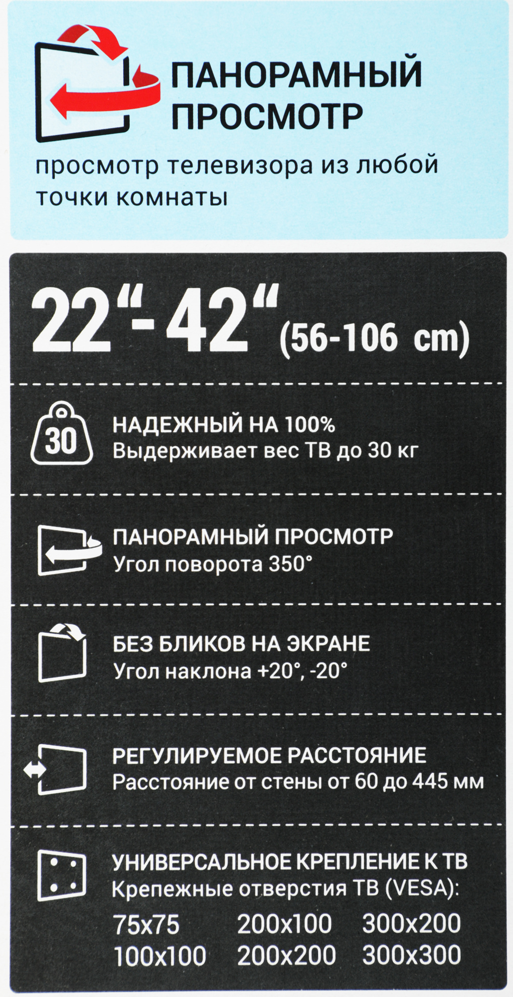 - Размер VESA: 75 x 75 мм, 100 x 100 мм, 200 x 100 мм, 200 x 200 мм, 200 x 300 мм, 300 x 300 мм