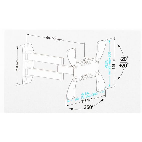 Holder LCDS-5066 - это кронштейн для крепления LCD панелей с диагональю от 19 до 40 дюймов. Его дизайн обеспечивает расстояние телевизора от стены - 60 - 445 мм. Он разработан в соответствии со стандартом VESA 75 х 75, 100 х 100, 200 х 100, 200 х 200, 200 х 300, 300 х 300 мм и может выдержать нагрузку до 30 кг. Фиксирующий механизм надежно удерживает телевизор.