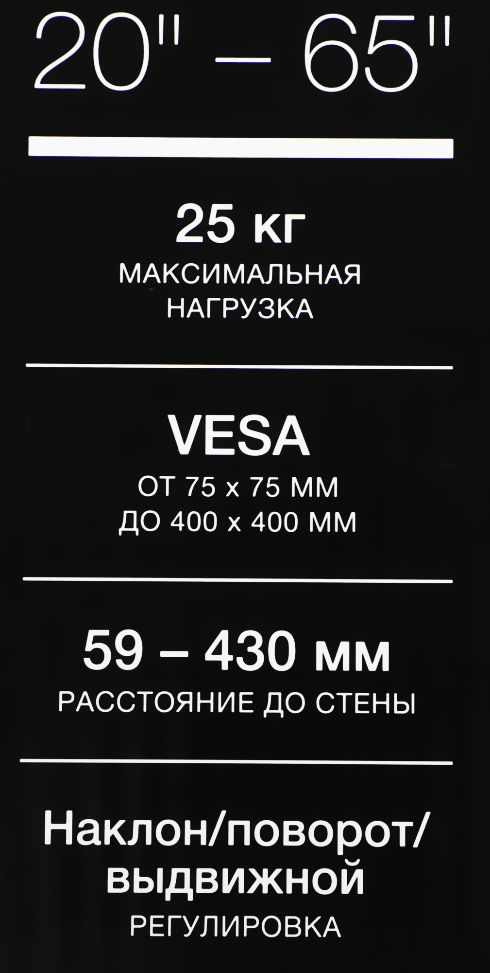| Подходит для телевизоров c диагональю | 22", 24", 26", 28", 32", 37", 39", 40", 42", 46", 48", 50", 52", 55", 60", 65" |