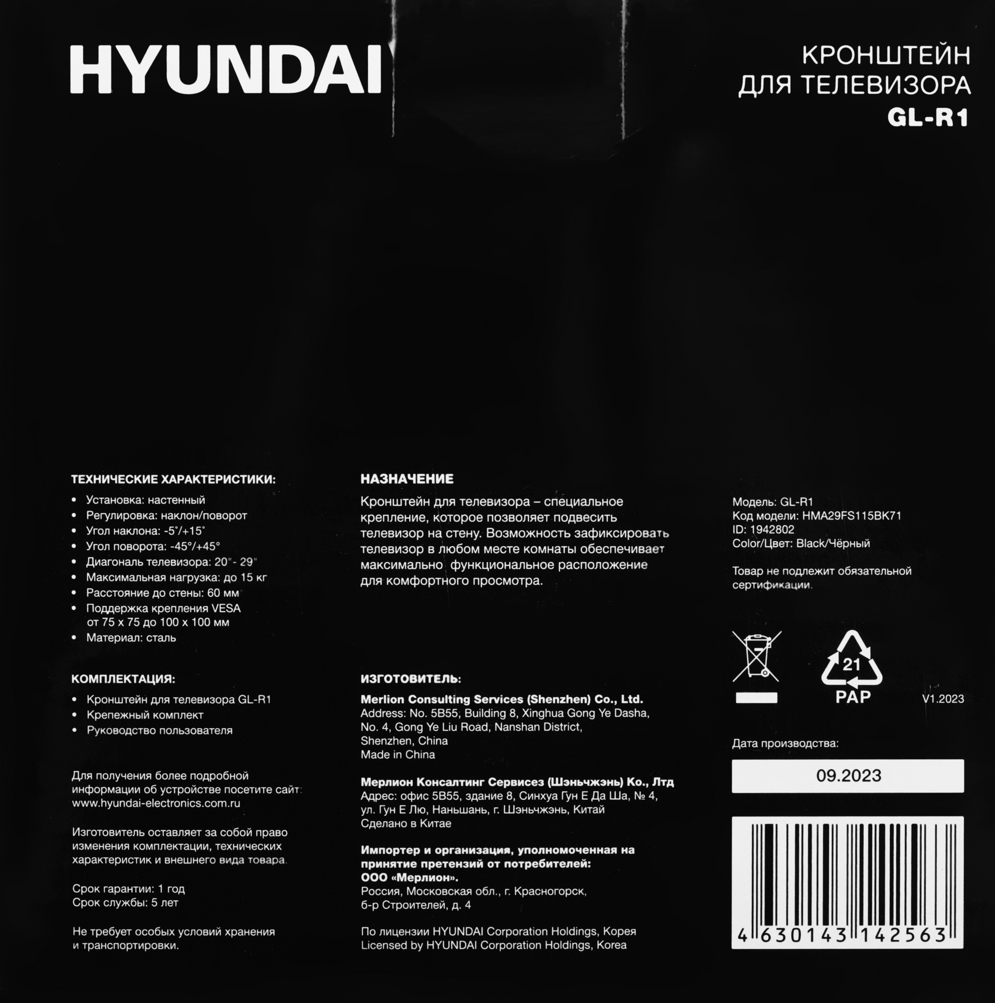 Наличие товара Hyundai GL-R1 [HMA29FS115BK71]