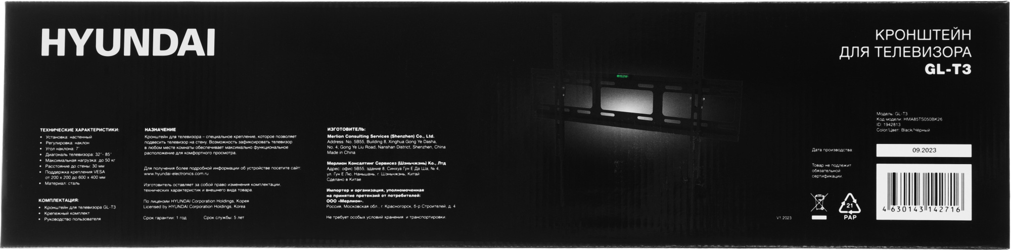 Кронштейн для телевизора Hyundai GL-T3 черный 32"-85" макс.50кг настенный наклон [HMA85TS050BK26]