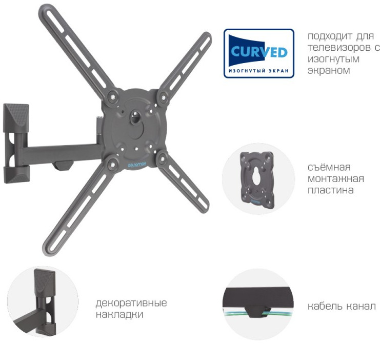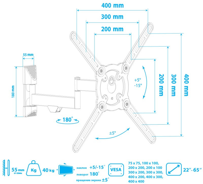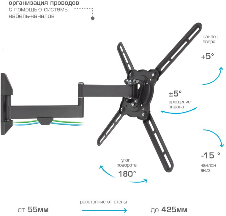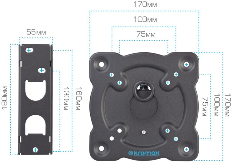 - KROMAX ATLANTIS-15 GREY TITAN надёжно удержит экран размером 22"-65" дюйма и весом 40 кг. Простая конструкция KROMAX ATLANTIS-15 GREY TITAN идеально подойдет для самостоятельного монтажа. Наклонно-поворотная регулировка позволит наклонять вверх и вниз на +5 -15°, поворачивать влево и вправо на 180°, и выдвигать на 55-425 мм