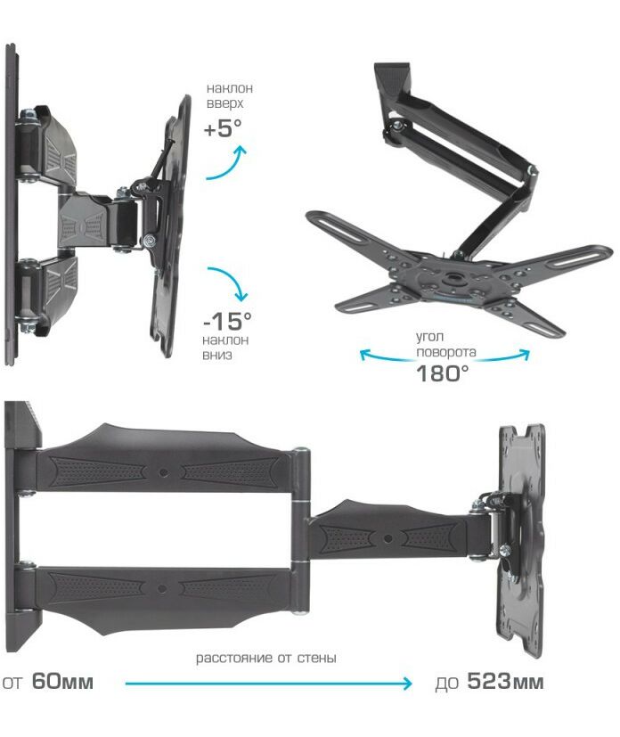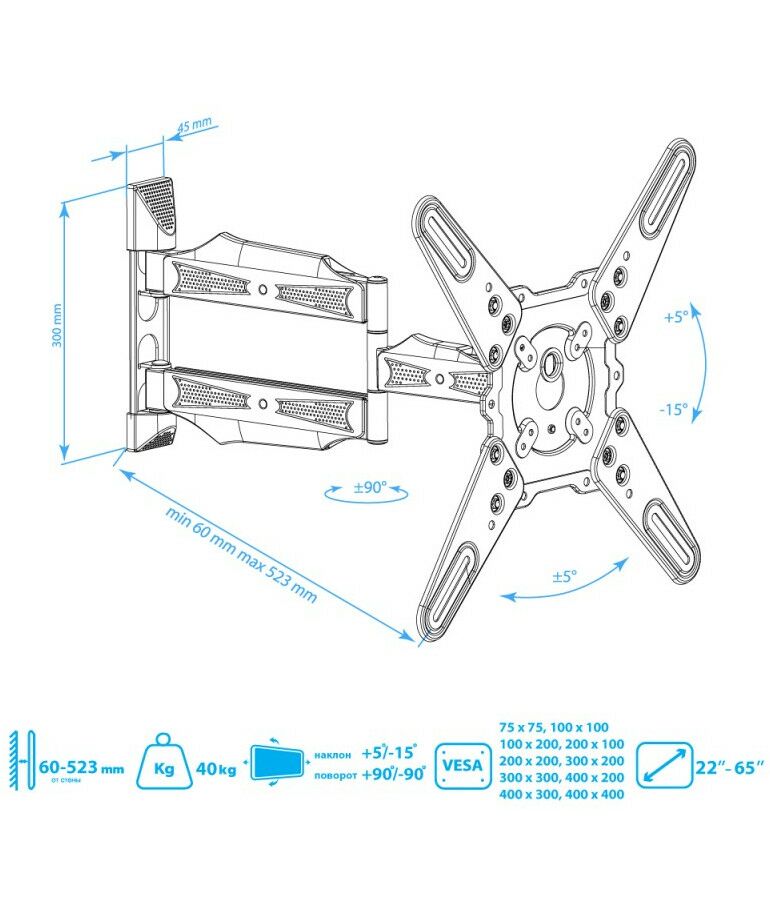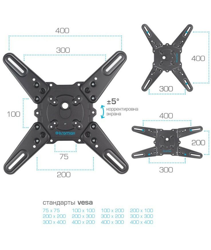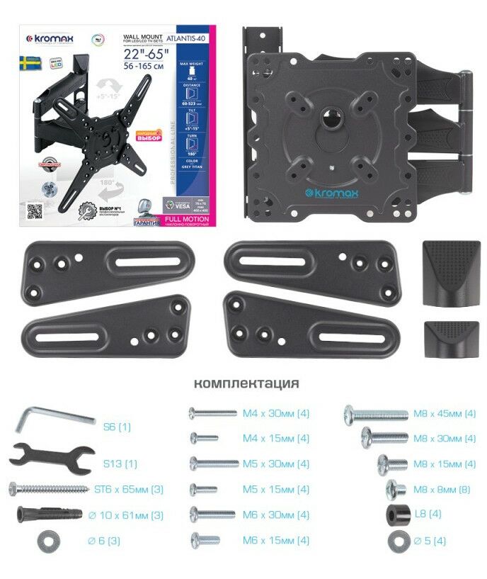 - KROMAX ATLANTIS-40 GREY TITAN надёжно удержит экран размером 22"-65" дюйма и весом 40 кг. Простая конструкция KROMAX ATLANTIS-40 GREY TITAN идеально подойдет для самостоятельного монтажа. Наклонно-поворотная регулировка позволит наклонять вверх и вниз на +5 -15°, поворачивать влево и вправо на 180°, и выдвигать на 60-523 мм