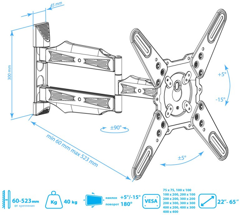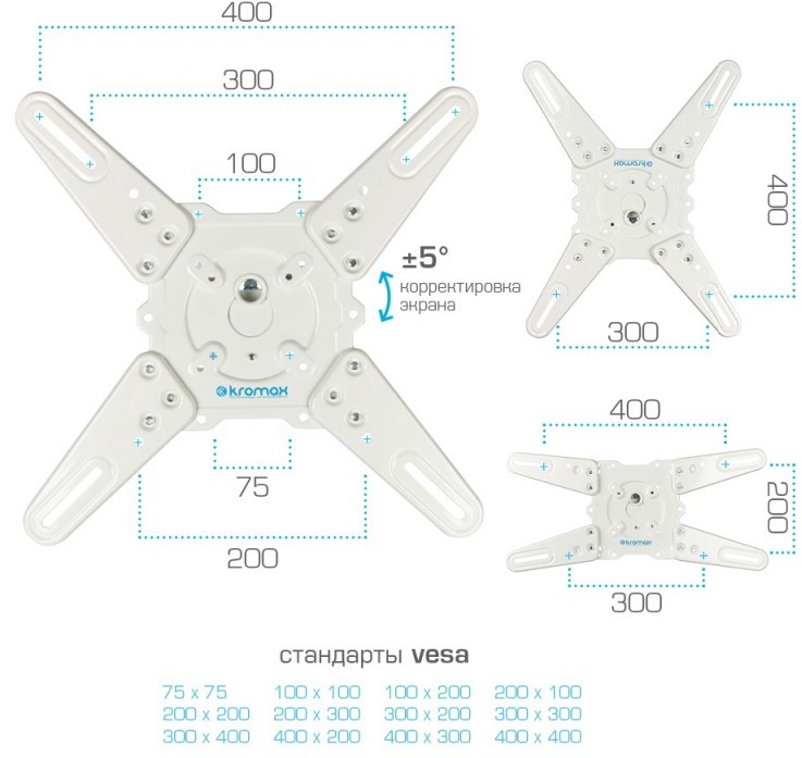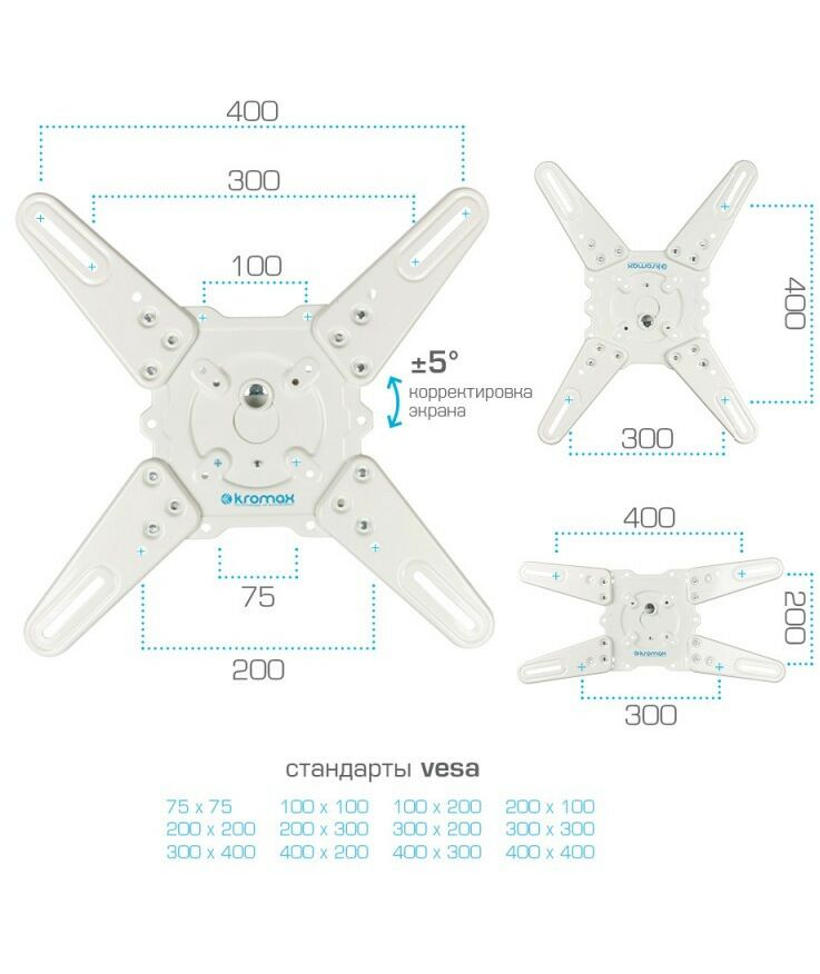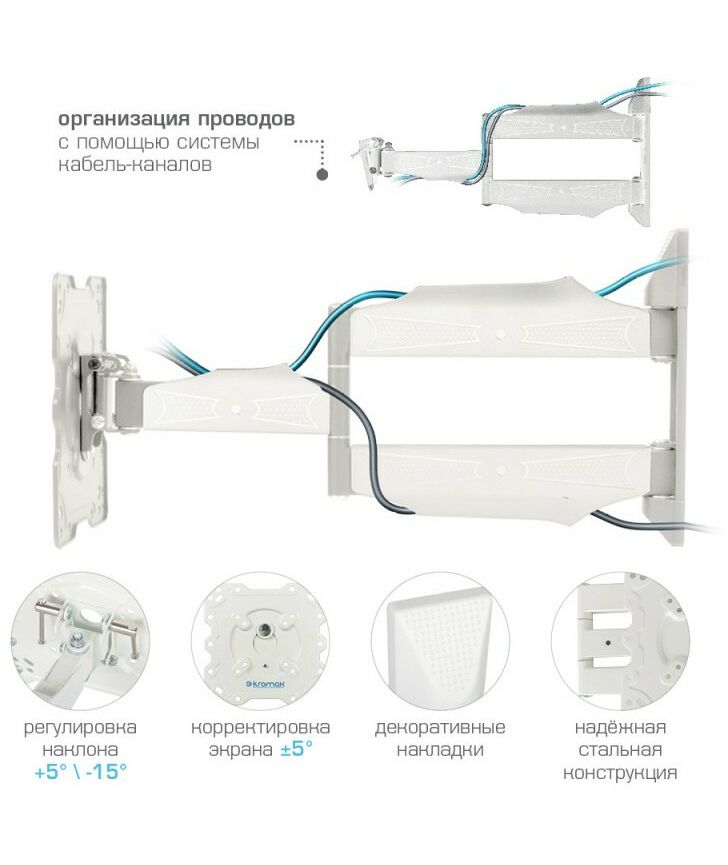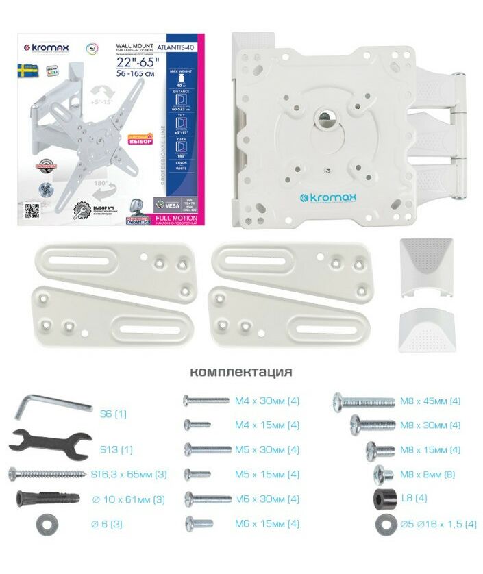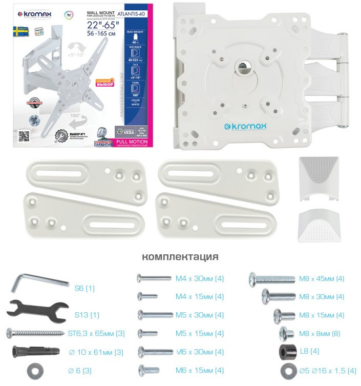 - KROMAX ATLANTIS-40 WHITE надёжно удержит экран размером 22"-65" дюйма и весом 40 кг. Простая конструкция KROMAX ATLANTIS-40 WHITE идеально подойдет для самостоятельного монтажа. Наклонно-поворотная регулировка позволит наклонять вверх и вниз на +5 -15°, поворачивать влево и вправо на 180°, и выдвигать на 60-523 мм