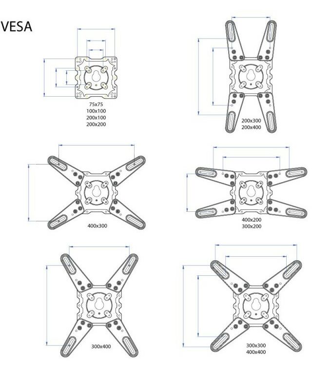- Крепежные отверстия (VESA) 75 x 75, 100 x 100, 100 x 200, 200 x 100, 200 x 200, 300 x 200, 300 x 300, 400 x 200, 400 x 300, 400 x 400