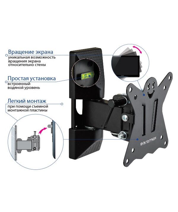 Наклонно-поворотный кронштейн для крепления к стене телевизоров и мониторов с не большой диагональю экрана. Высококачественная стальная конструкция обеспечит надежное и безопасное использование. Легко снимающаяся монтажная пластина облегчит процесс уборки.