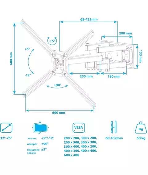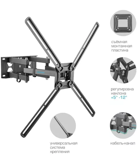 | Подходит для телевизоров c диагональю | 32", 37", 39", 40", 42", 46", 48", 50", 52", 55", 60", 65", 70", 75" |