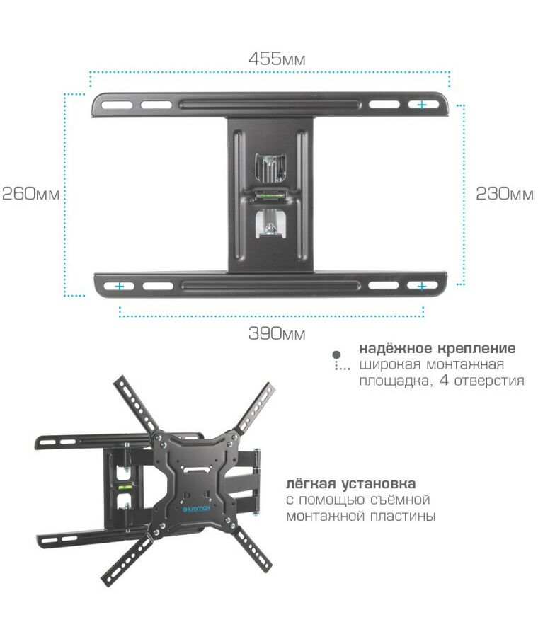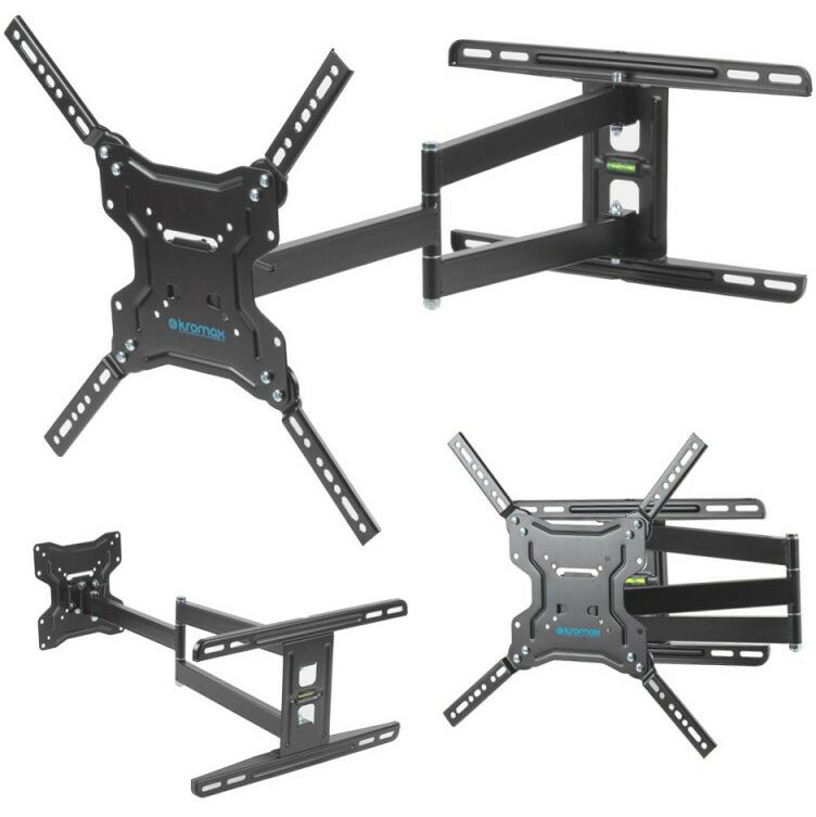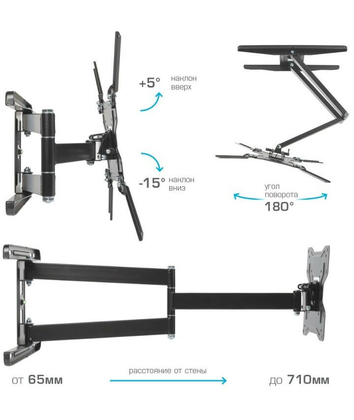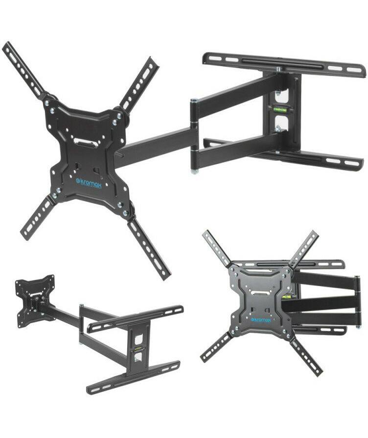 - Универсальный - телевизор на кронштейне можно наклонить, повернуть и сдвинуть к стене