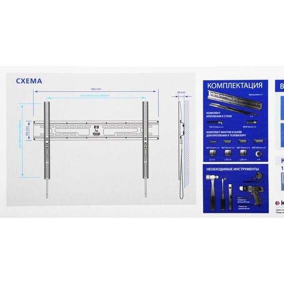 | Особенности | Простая установка при помощи встроенного водяного уровня. Крепление направляющей с «двойным крючком». Надежная стальная конструкция. Система крепления TechLock обеспечивает легкий монтаж/демонтаж ТВ и его надежную фиксацию. |