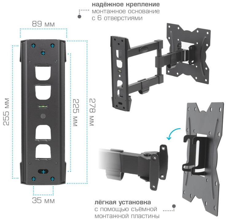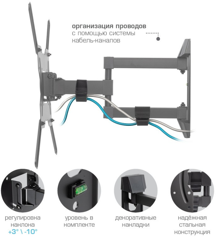 - Кронштейн для телевизора, комплект ключей и крепежа для установки ТВ, навесной уровень, подробная инструкция на русском языке