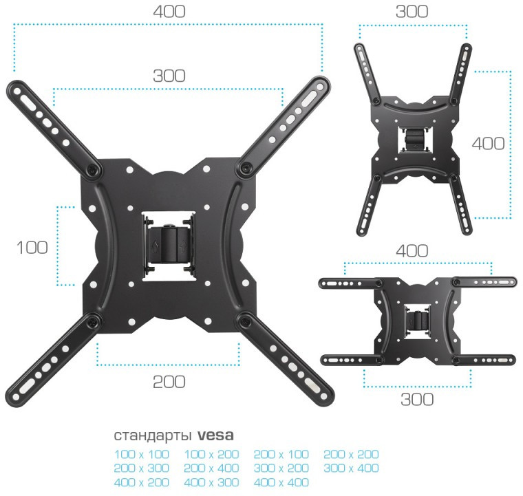 - Крепежные отверстия (VESA) 100 x 100, 200 x 100, 200 x 200, 300 x 200, 300 x 300, 400 x 200, 400 x 300, 400 x 400
