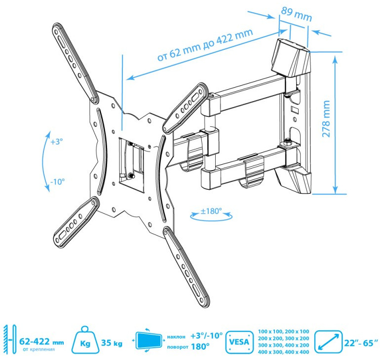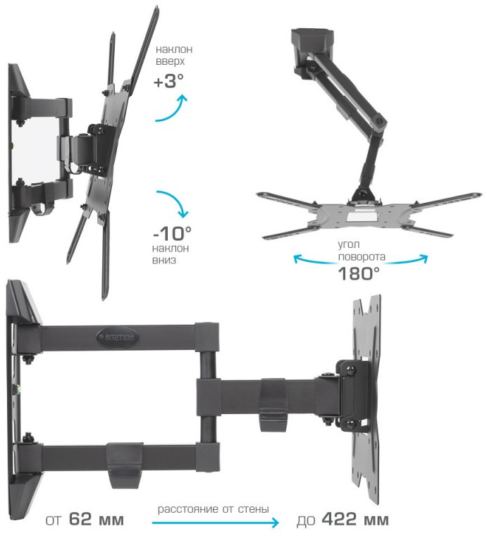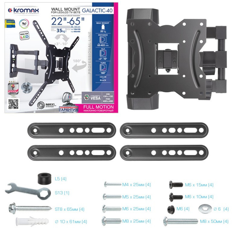 - KROMAX GALACTIC-40 BLACK надёжно удержит экран размером 22"-65" дюйма и весом 35 кг. Простая конструкция KROMAX GALACTIC-40 BLACK идеально подойдет для самостоятельного монтажа. Наклонно-поворотная регулировка позволит наклонять вверх и вниз на +3 -10°, поворачивать влево и вправо на 180°, и выдвигать на 62-422 мм