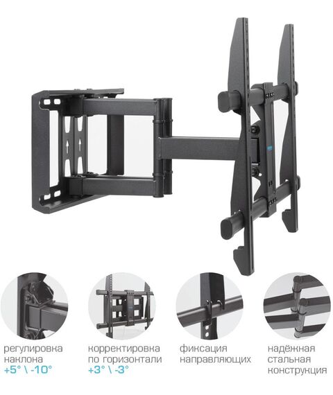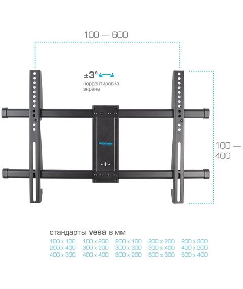 | Особенности | Усиленное настенное основание, Надежная стальная конструкция максимальная нагрузка до 60 кг, Универсальная система крепления, Легкий монтаж при помощи съемной монтажной пластины, Корректировка экрана - уникальная возможность вращения экрана на ±3° относительно стены |