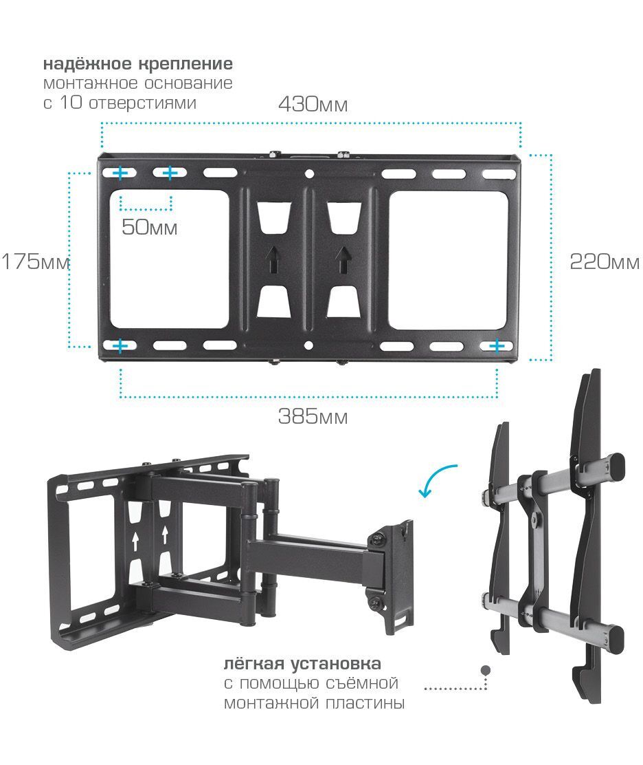| Подходит для телевизоров c диагональю | 32", 37", 39", 40", 42", 43", 46", 48", 50", 52", 55", 60", 65", 70", 75" |