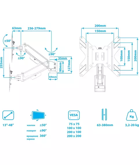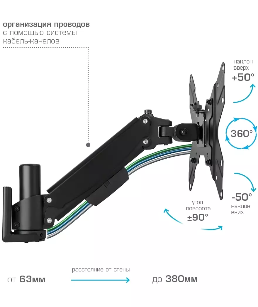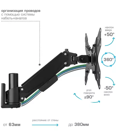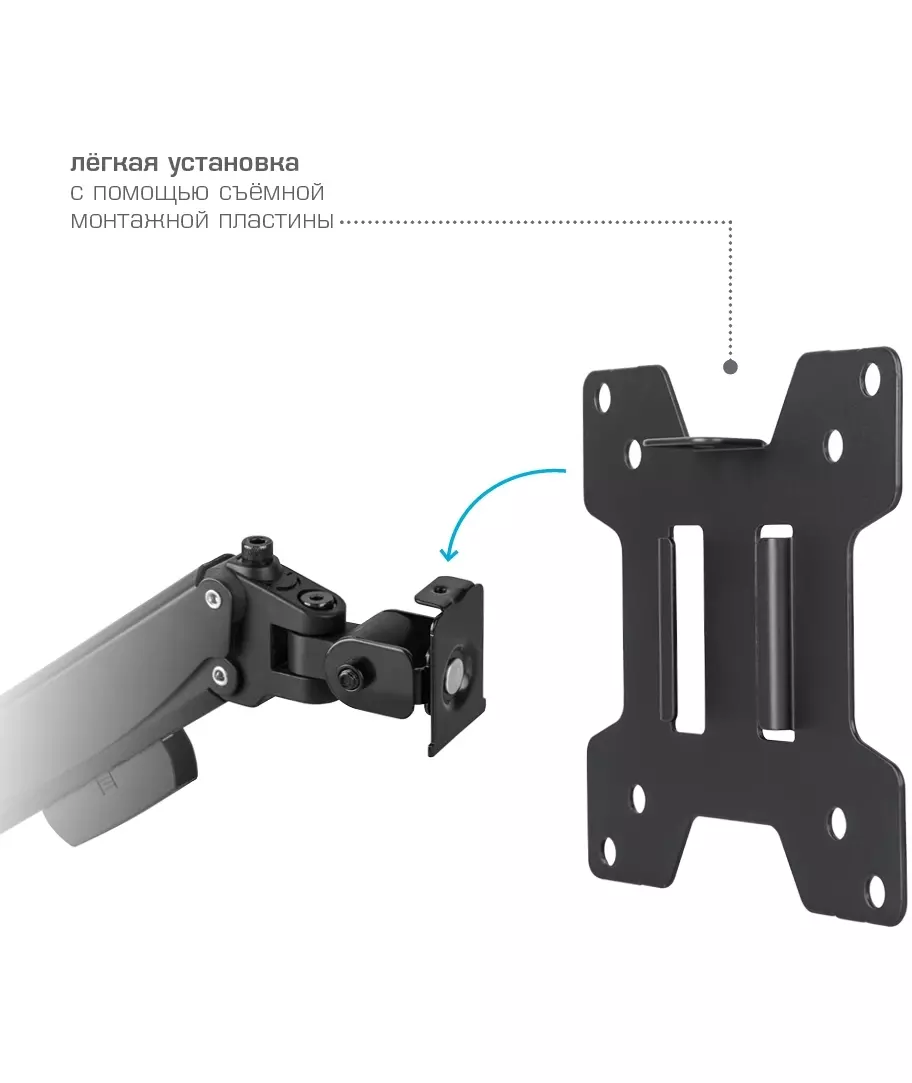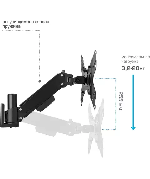 | Особенности | Универсальная система крепления, Легкий монтаж при помощи съемной монтажной пластины, Регулирующаяся газовая пружина, Мощная стальная конструкция - максимальная нагрузка 3,2-20 кг, Кабель канал |