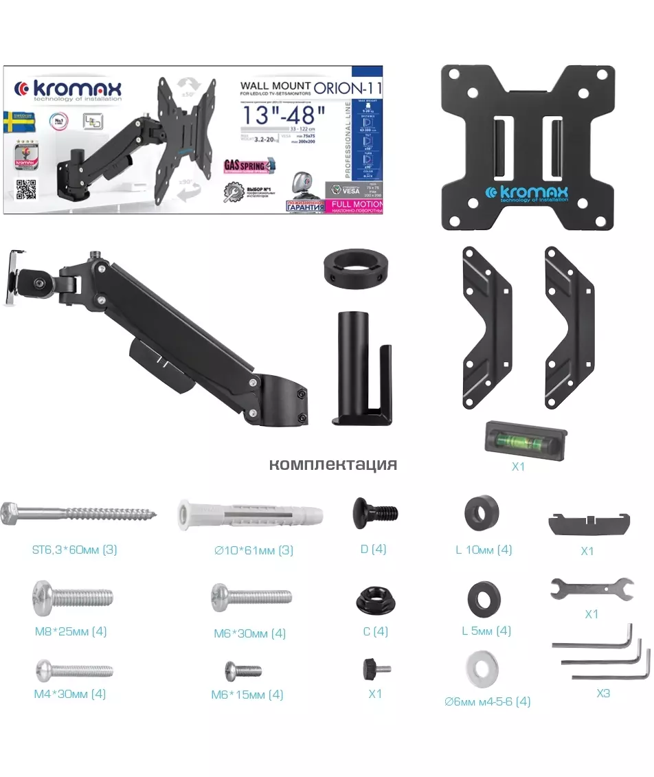 Кронштейн для телевизора Kromax ORION-11 черный 13"-48" макс.20кг настенный поворот и наклон [90529]