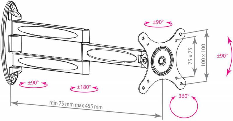 Надежная алюминиевая конструкция. Универсальная система крепления. Кронштейн отодвигается от стены на 455 мм. Телевизор на кронштейне можно наклонить, повернуть и сдвинуть к стене.