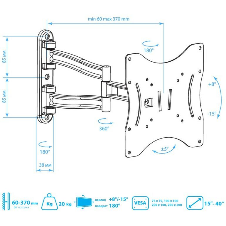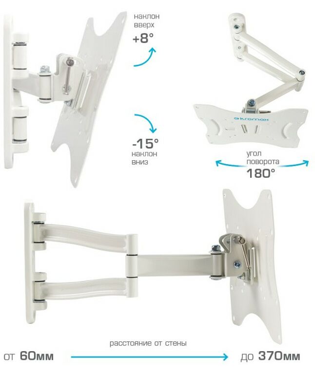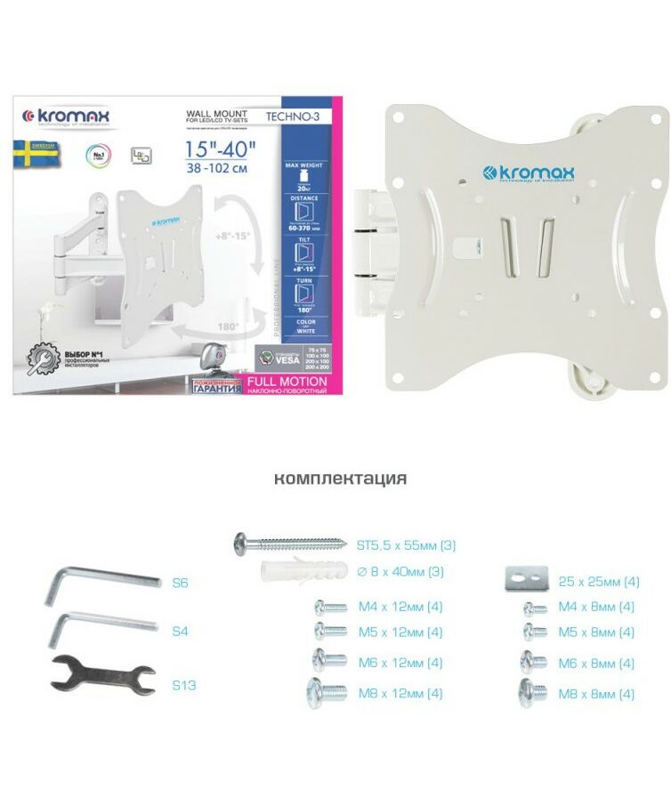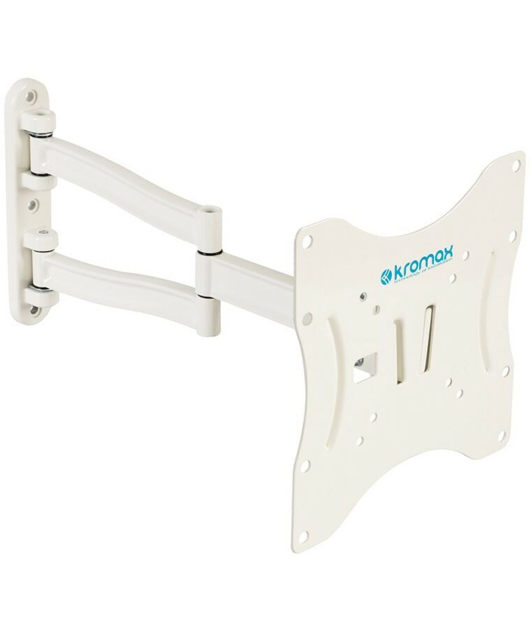 - KROMAX TECHNO-3 WHITE надёжно удержит экран размером 15"-40" дюйма и весом 20 кг. Простая конструкция KROMAX TECHNO-3 WHITE идеально подойдет для самостоятельного монтажа. Наклонно-поворотная регулировка позволит наклонять вверх и вниз на +8 -15°, поворачивать влево и вправо на 180°, и выдвигать на 60-370 мм