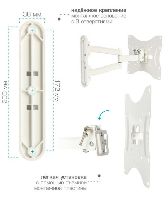 - Кронштейн для телевизора, комплект ключей и крепежа для установки ТВ, подробная инструкция на русском языке