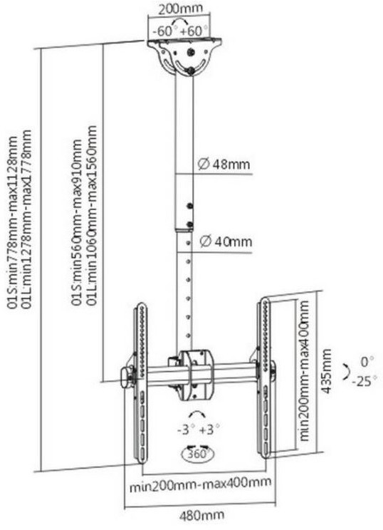 - Потолочный кронштейн для LCD/LED телевизоров размером от 26 до 65 дюймов с максимальным весом до 55 кг. с возможностью крепления на наклонный потолок